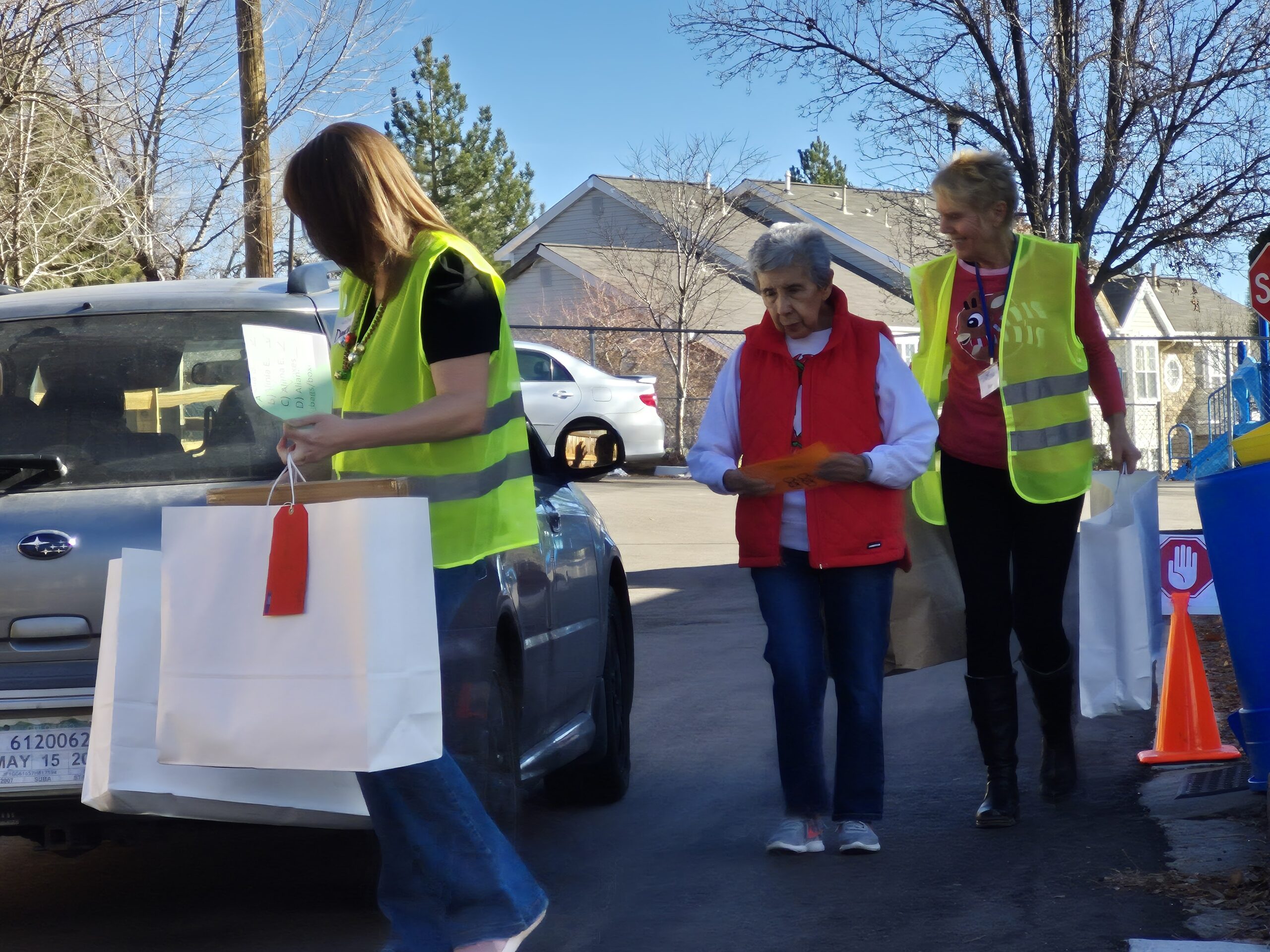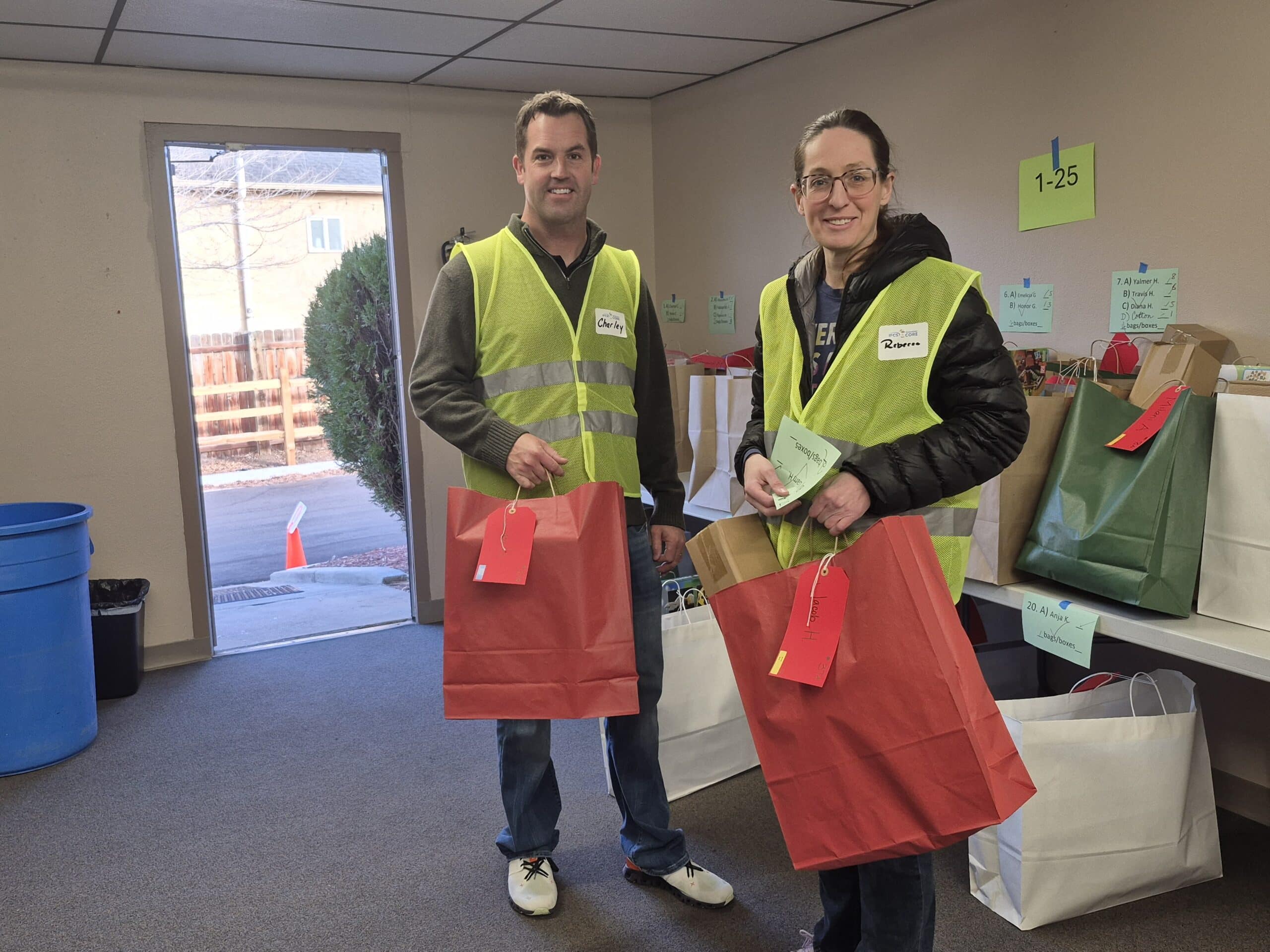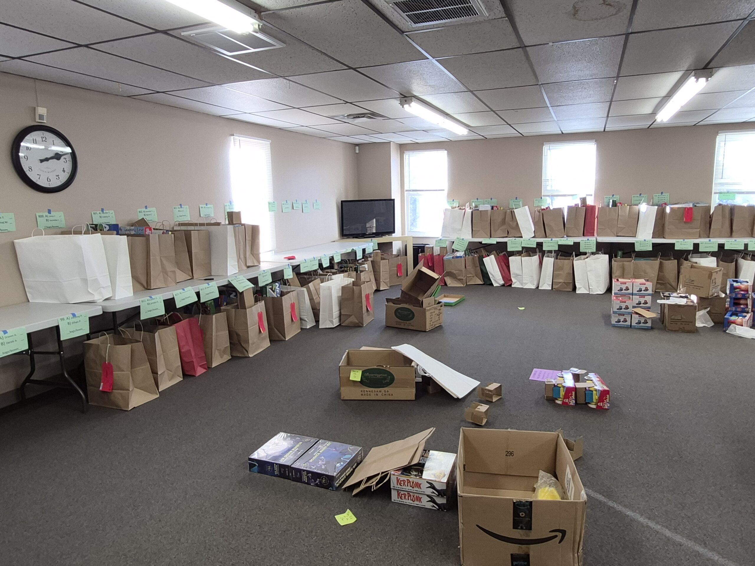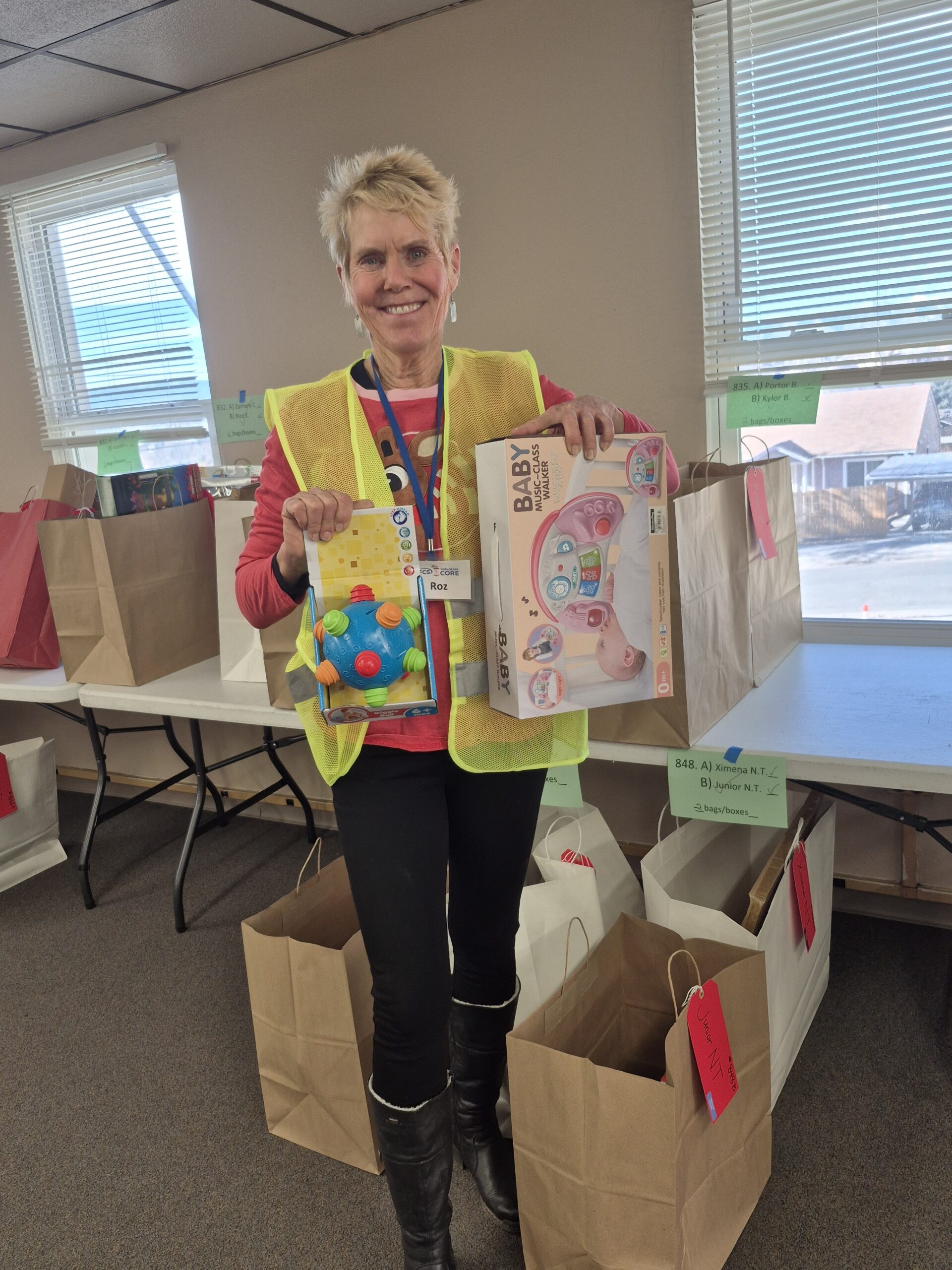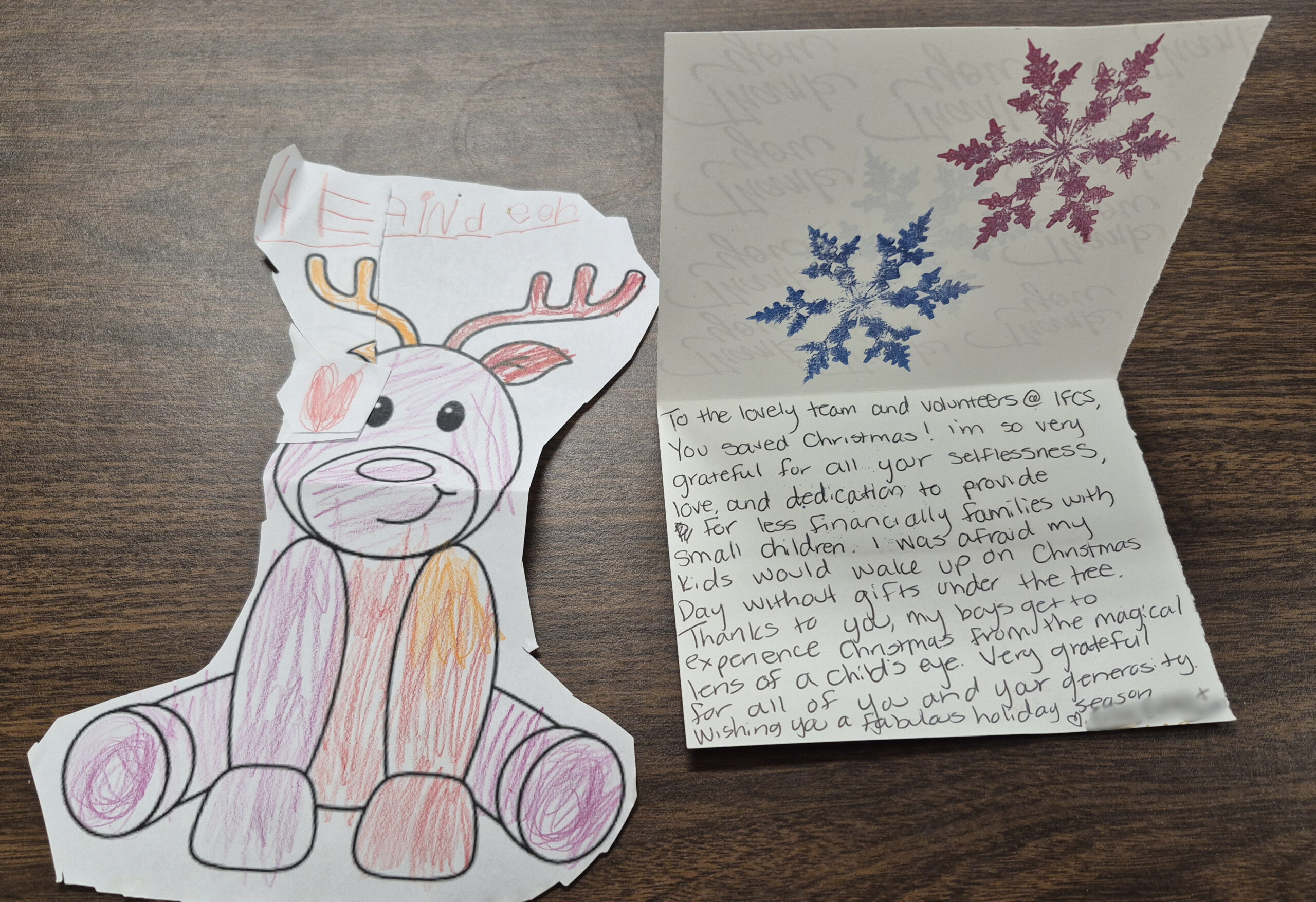 Noteworthy Photos: This year we had 3 generations of board directors helping at the distribution event, ranging from the 1990s to today: Ann H, Dolores H, Brad A (current) and Ana H (current)! And don’t miss the colored reindeer and note of gratitude from one of the families who picked up gifts.